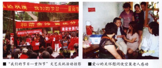 在九九重阳节来临之际,中心积极与辖区各个社区紧密配合,开展了丰富多彩的庆祝活动。并认真按照区卫生局的活动通知要求:在光荣北路社区开展了“爱老敬老,关爱空巢老人”为主题的志愿服务;在铁路新村社区开展了“敬天下老人,扬中华美德”为主题的送健康服务活动;在金沙路社区联合开展了“我们的节日——重阳节,祝天下老人健康快乐”的大型文艺演出庆祝活动,将抚琴辖区的“重阳节”庆祝活动推向了高潮。在本次庆祝重阳节系列活动中,中心自8月起与铁路新村等8个社区联合开展活动38次,关爱空巢老人2人、为4000余名65岁以上的老人做了免费健康体检、建立健康档案6000余份、发放健康知识手册2万余册、参加服务医务人员130人次。通过上述活动的开展,社区老人非常的感动和高兴,纷纷称赞党和政府对老人关怀备至,并非常感谢社区医务人员的辛勤劳动。